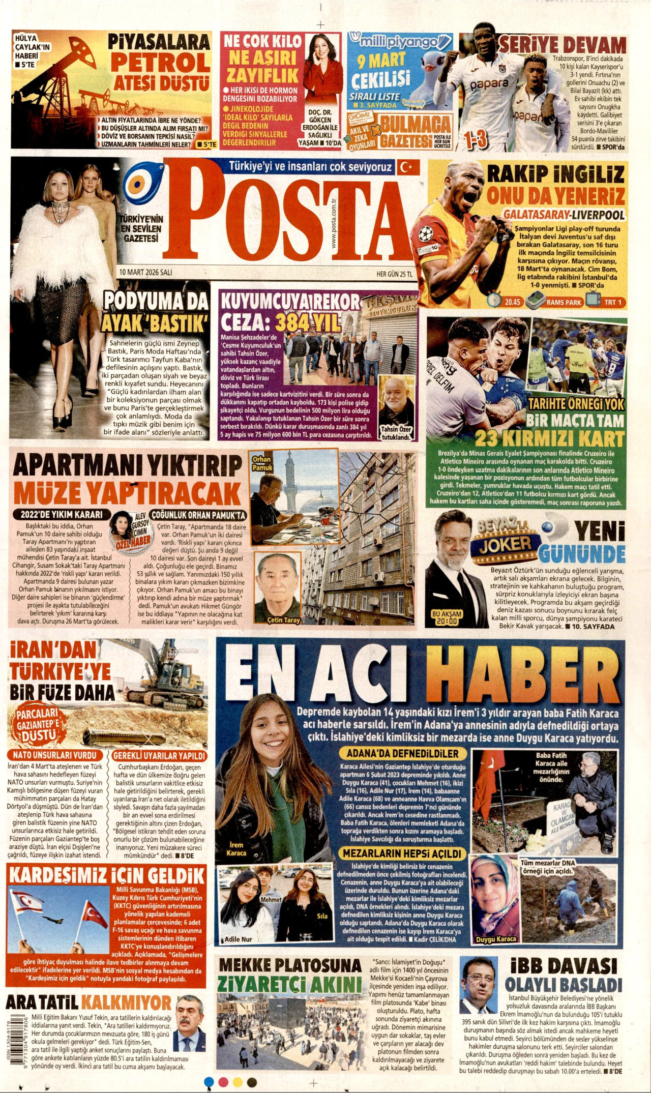 POSTA Gazetesi 10 Mart 2026, Salı Günü Manşeti