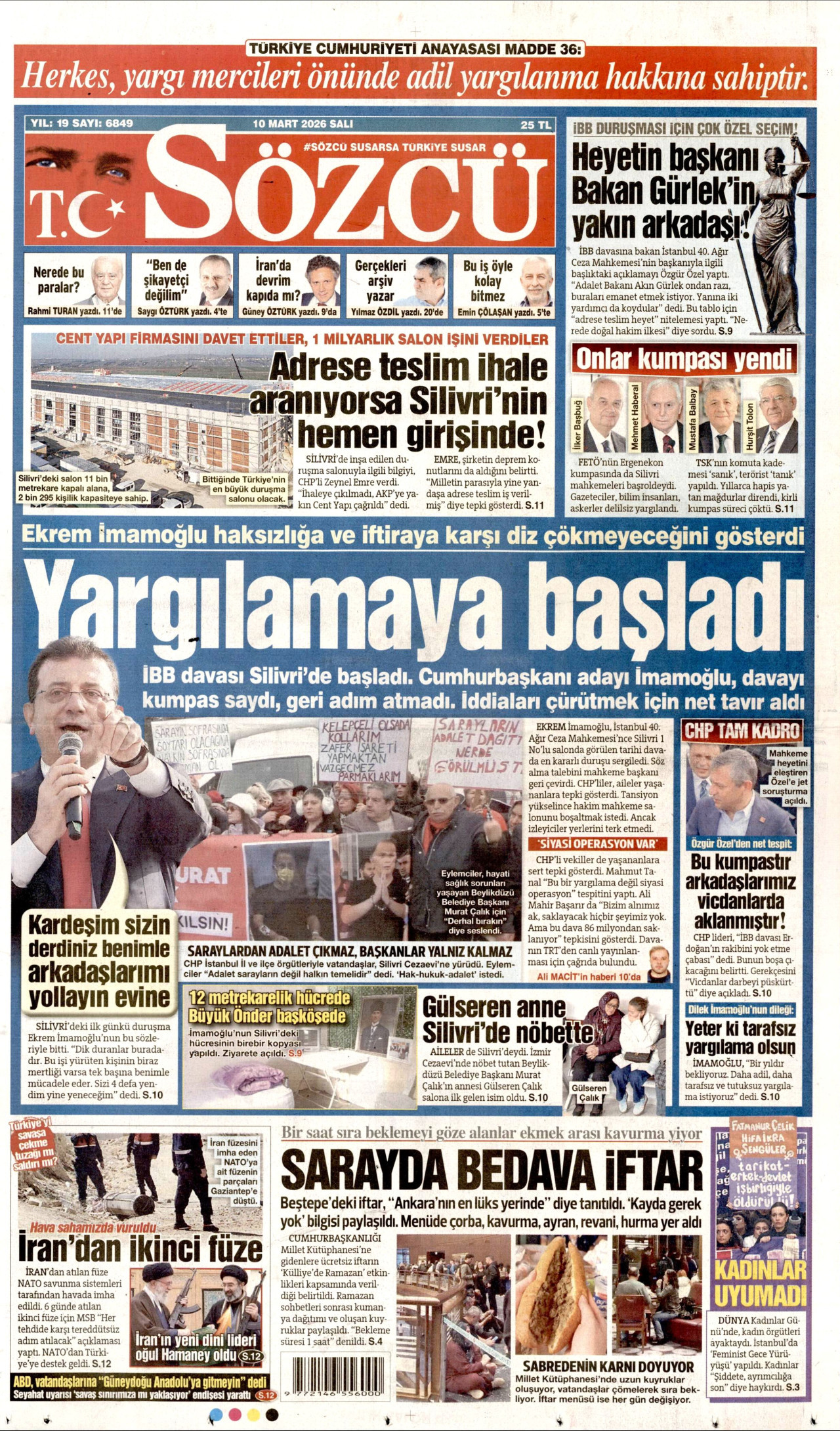 SÖZCÜ Gazetesi 10 Mart 2026, Salı Günü Manşeti